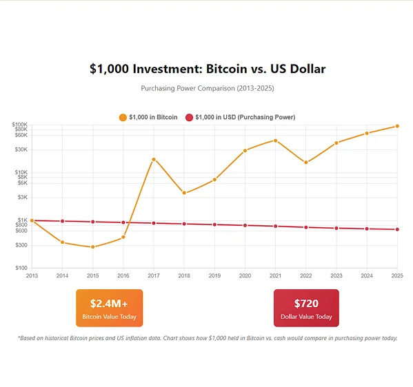 Unlike traditional currencies that lose purchasing power to inflation, Bitcoin is mathematically scarce with only 21 million coins that will ever exist. This scarcity, combined with growing global adoption, has driven unprecedented value appreciation. Many analysts project Bitcoin could see another 10x growth over the next decade as institutional adoption accelerates and monetary debasement continues.